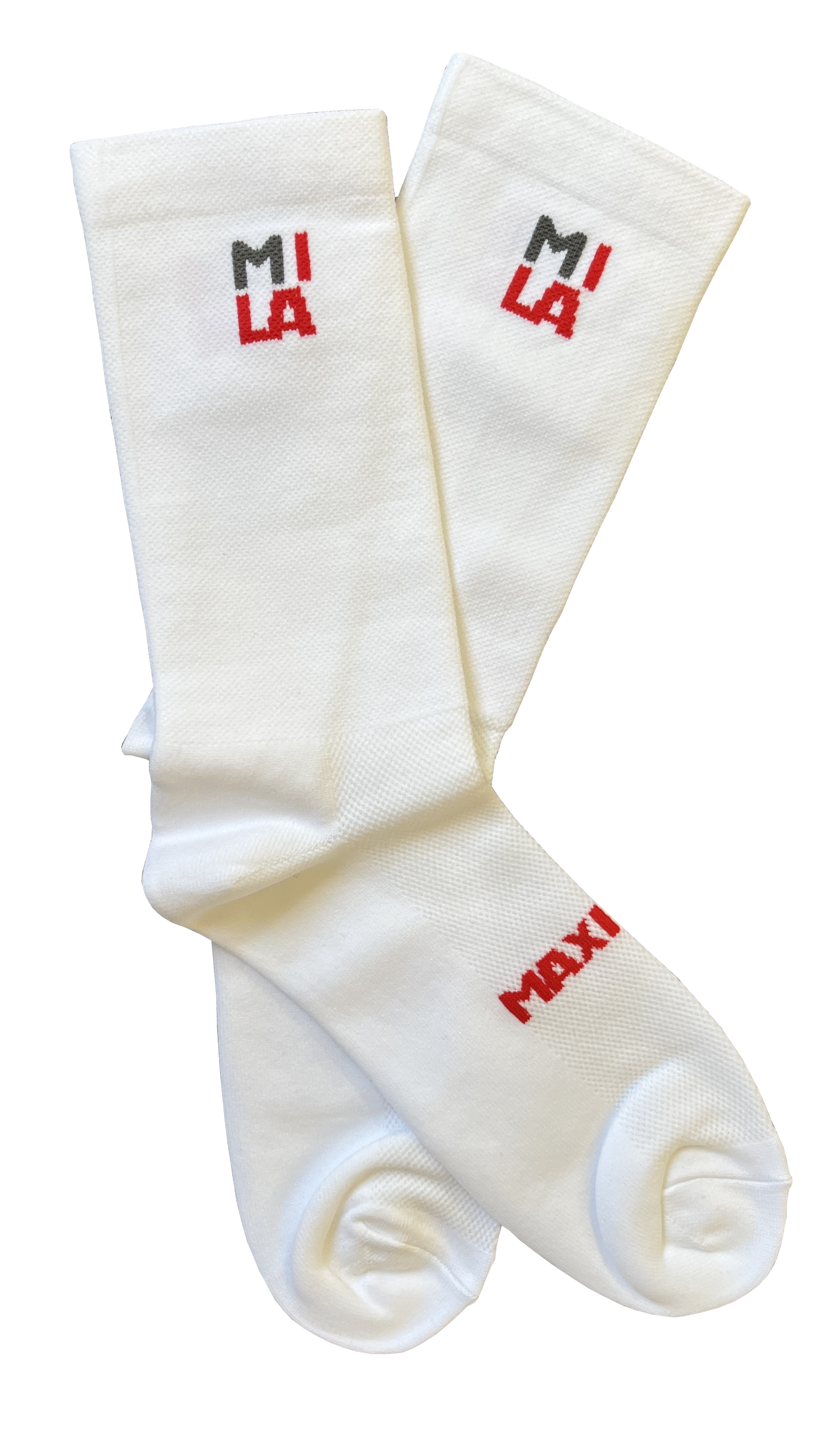 Our best selling cycling sock in white. Hot orange and white MILA logo (MAXIMUM Industries Los Angeles)